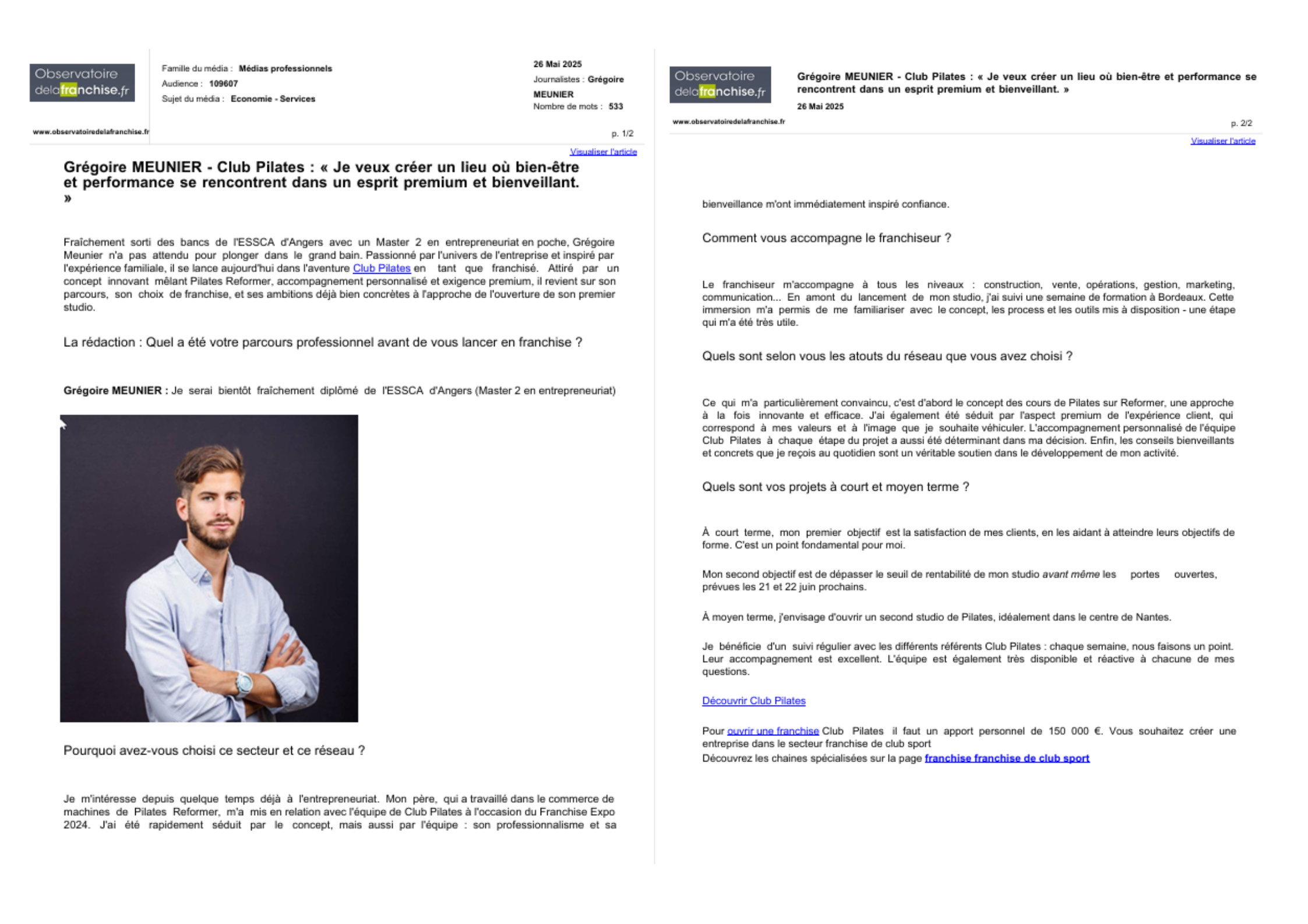 Fraîchement diplômé de l’ESSCA, Grégoire Meunier se lance comme franchisé Club Pilates à Nantes Forum d'Orvault. Séduit par le concept innovant du Pilates Reformer et l’accompagnement premium du réseau, il ambitionne de proposer une expérience client personnalisée unique avec l’ouverture récente de son premier studio, puis d’un second à moyen terme.